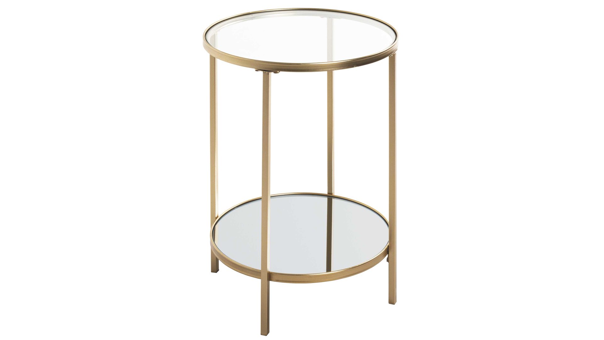 Der Beistelltisch ist mit seinem modernen und eleganten Design ein absoluter Hingucker. Er kombiniert ein goldfarben lackiertes Metallgestell mit zwei Ablagen: Die obere besteht aus Sicherheitsglas und die untere aus Spiegelglas. Dank der hochwertigen Materialien ist das Tischchen robust, widerstandsfähig und langlebig. Seine Maße belaufen sich auf ca. 55 x 39 cm (HxD).
