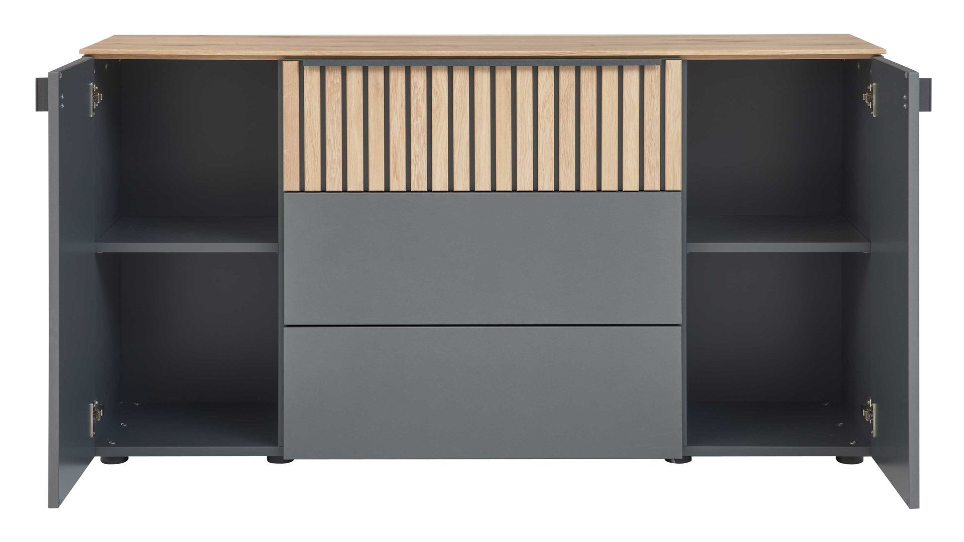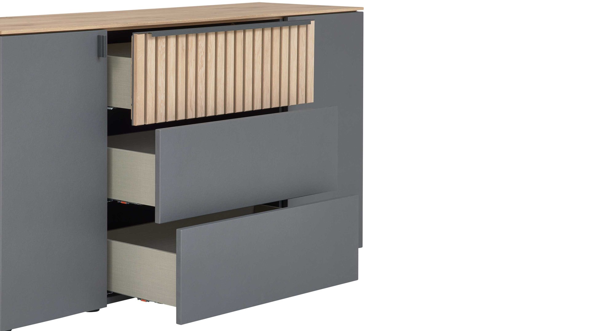 Die Kombikommode 528143 aus der Interliving Schlafzimmer Serie 1029 kombiniert Wildeiche-Massivholz mit graphitfarbenem Lack.