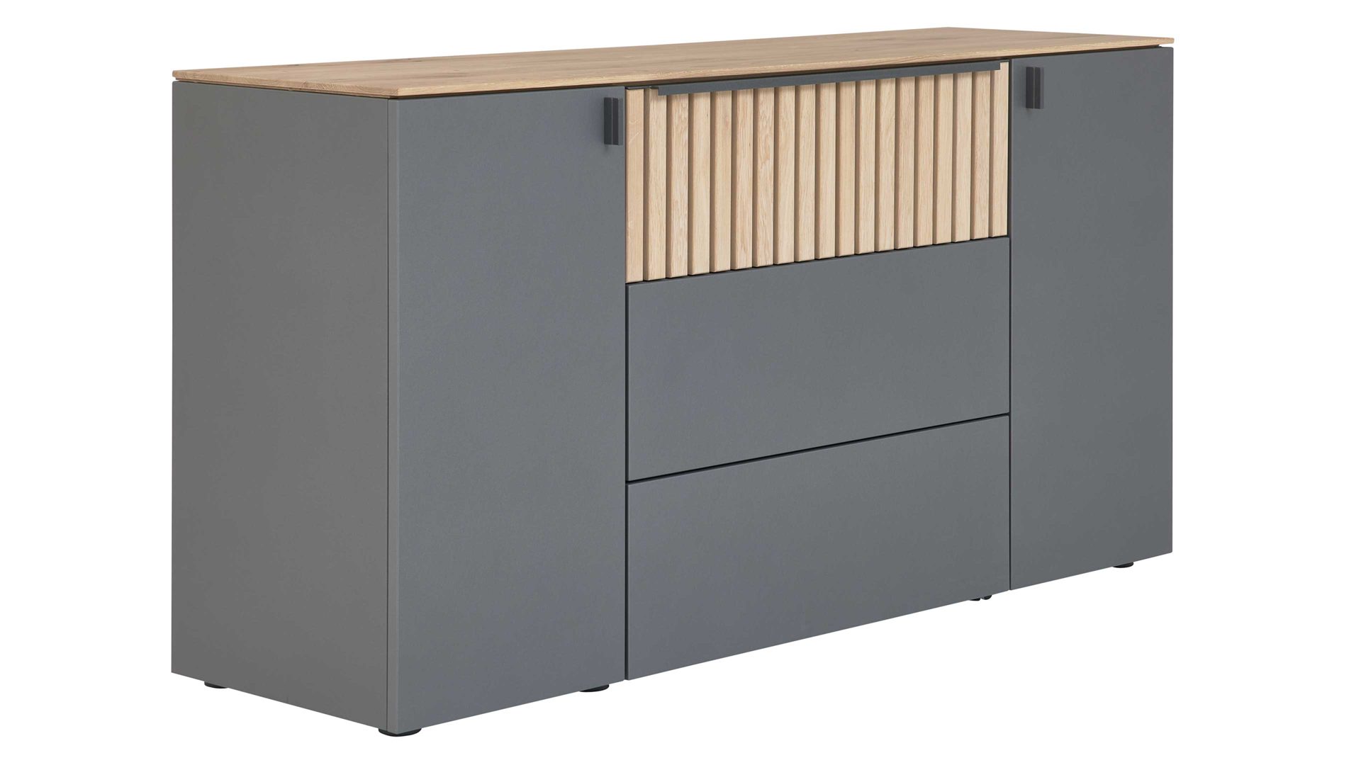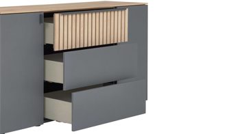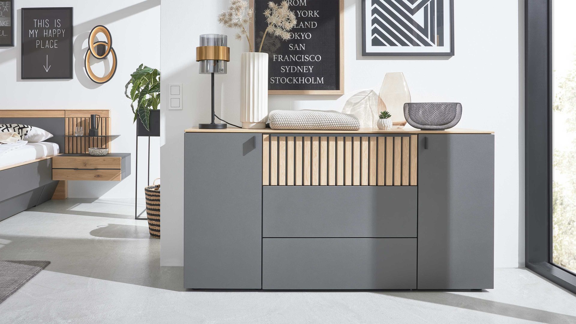 Die Kombikommode aus der Interliving Schlafzimmer Serie 1029 verbindet edles Wildeiche-Massivholz mit graphitfarbenem Lack zu einem modernen, harmonischen Gesamtbild. In Eisenglimmer pulverbeschichtete Metallgriffe setzen stilvolle Akzente und unterstreichen die hochwertige Wirkung dieser Wohnlösung.