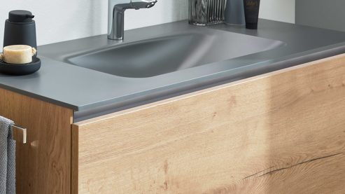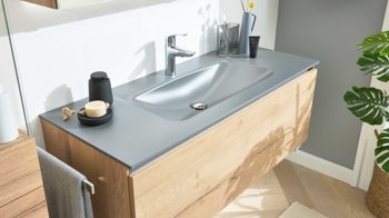 Ein optisches Highlight ist der schiefergraue Duratek® Waschtisch (Typ 87724). Das innovative Vollacryl-Verbundmaterial vereint Quarz, keramische Nanopartikel und moderne Acrylharze zu einer ultrakompakten, seidig-matten Oberfläche. Sie ist besonders pflegeleicht, kratz- und stoßfest, farbstabil und vermittelt ein edles, samtiges Gefühl. Maße: ca. 121 x 12 x 49 cm (B/LxHxT), mit Hahnlochbohrung, ohne Überlauf.