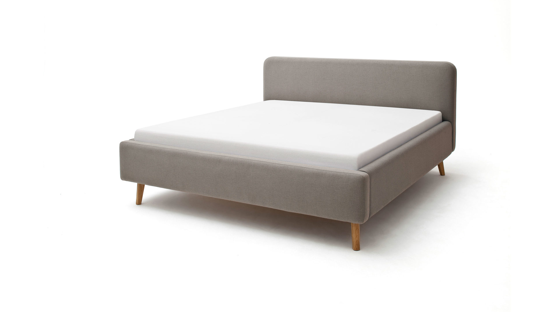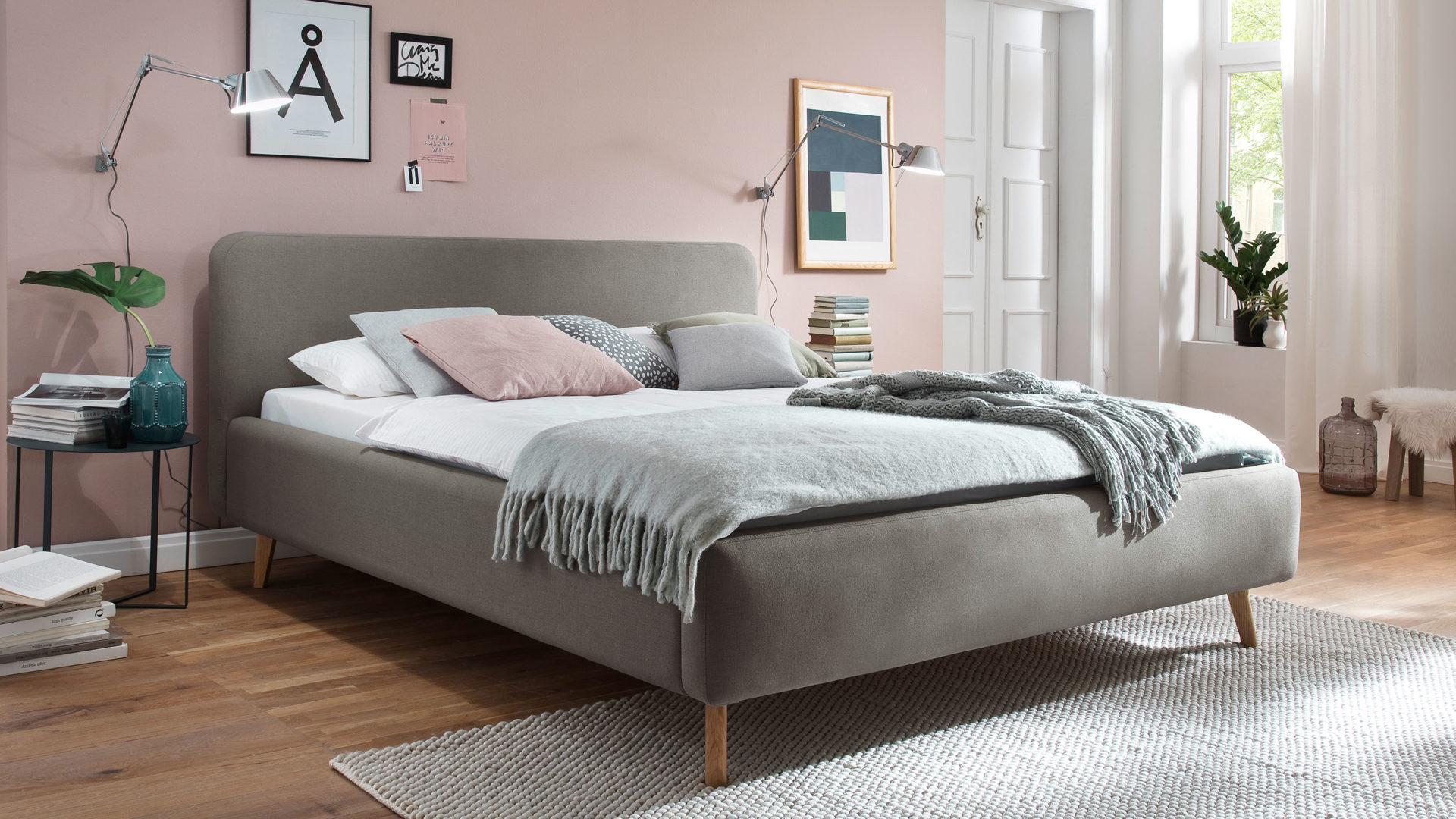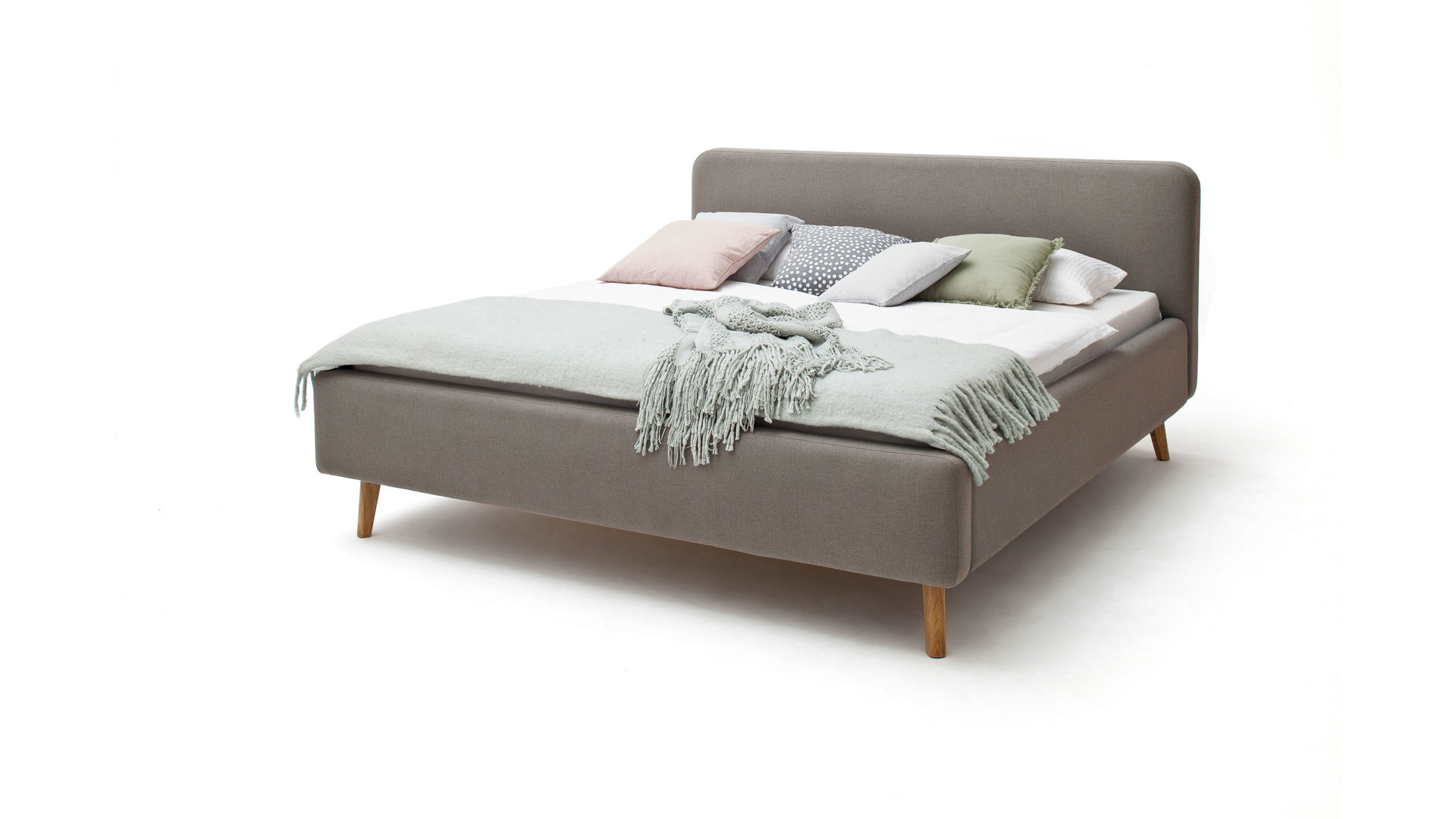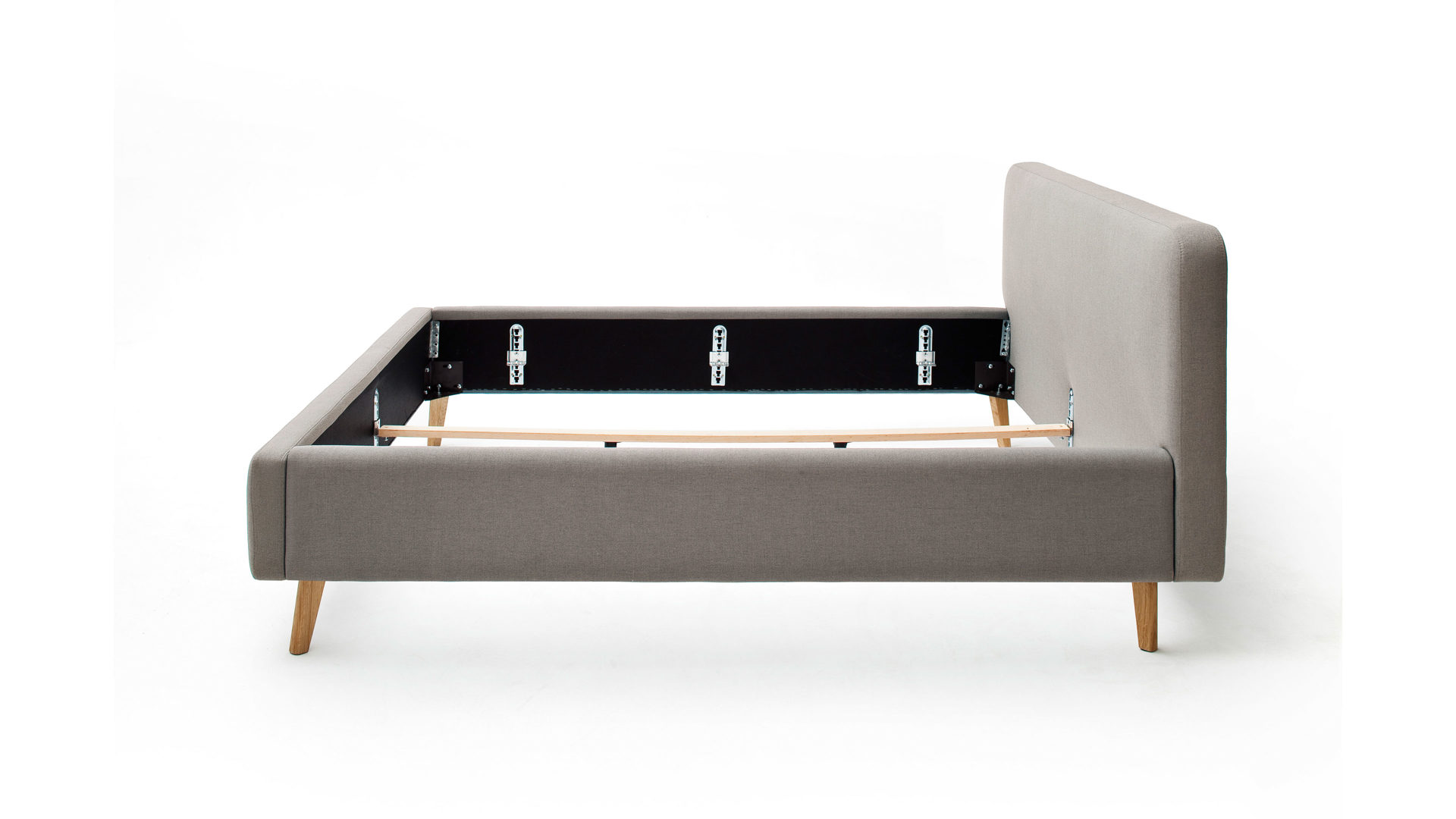 Das Polsterbettgestell Mattis begeistert durch die elegante Optik sowie die hervorragende Material- und Verarbeitungsqualität. Es kombiniert einen anthrazitfarbenen Flachgewebe-Bezug mit eichefarbenen Holzfüßen. Sowohl die Bettseiten als auch das Polsterkopfteil sind glatt bezogen. Letzteres lädt Sie ein, sich anzulehnen, wenn Sie abends im Bett vor dem Schlafen noch fernsehen oder in einem Buch lesen.