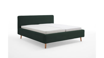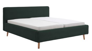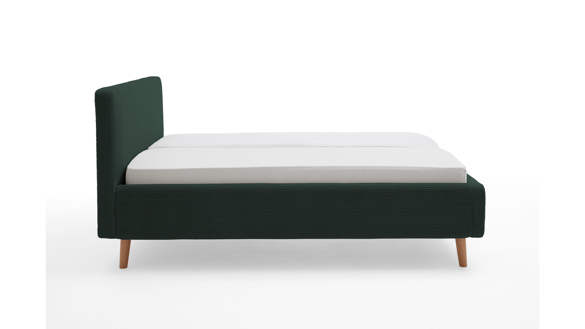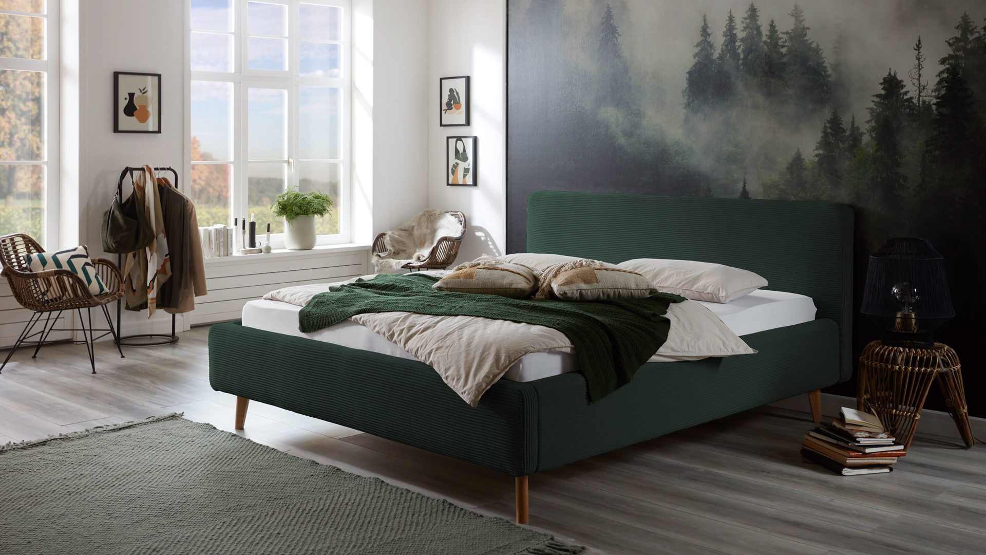 Das Polsterbettgestell Mattis begeistert durch die elegante Optik sowie die hervorragende Material- und Verarbeitungsqualität. Es kombiniert einen dunkelgrünen Breitcord-Bezug mit eichefarbenen Holzfüßen. Sowohl die Bettseiten als auch das Polsterkopfteil sind glatt bezogen. Letzteres lädt Sie ein, sich anzulehnen, wenn Sie abends im Bett vor dem Schlafen noch fernsehen oder in einem Buch lesen.