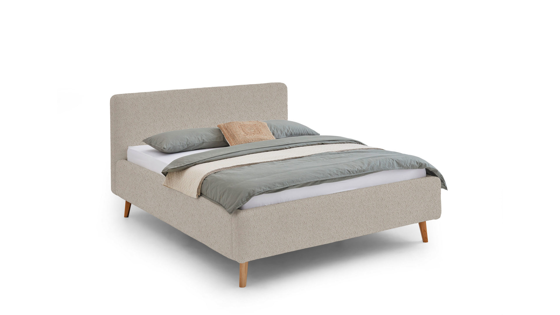 Mit den eichefarbenen Holzfüßen und dem beigefarbenen Boucle-Bezug bringt das Polsterbettgestell Mattis maritimes Flair in Ihr Schlafzimmer.