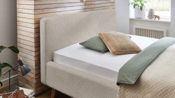 Die warme Farbe der Füße kontrastiert mit dem frischen Ton des Bezugs - und doch harmonieren die beiden Nuancen hervorragend und verführen zu Traumreisen - beziehungsweise Reiseträumen - ans Meer und einen herrlich warmen Sandstrand. Ein weiteres Highlight des rundum überzeugenden Bettgestells bildet das glatt bezogene Polsterkopfteil. Dieses ermöglicht durch die weiche Haptik auch entspannt angelehntes Sitzen, etwa abends beim Lesen vor dem Schlafen oder morgens beim Blick aus dem Fenster zum Wachwerden.
