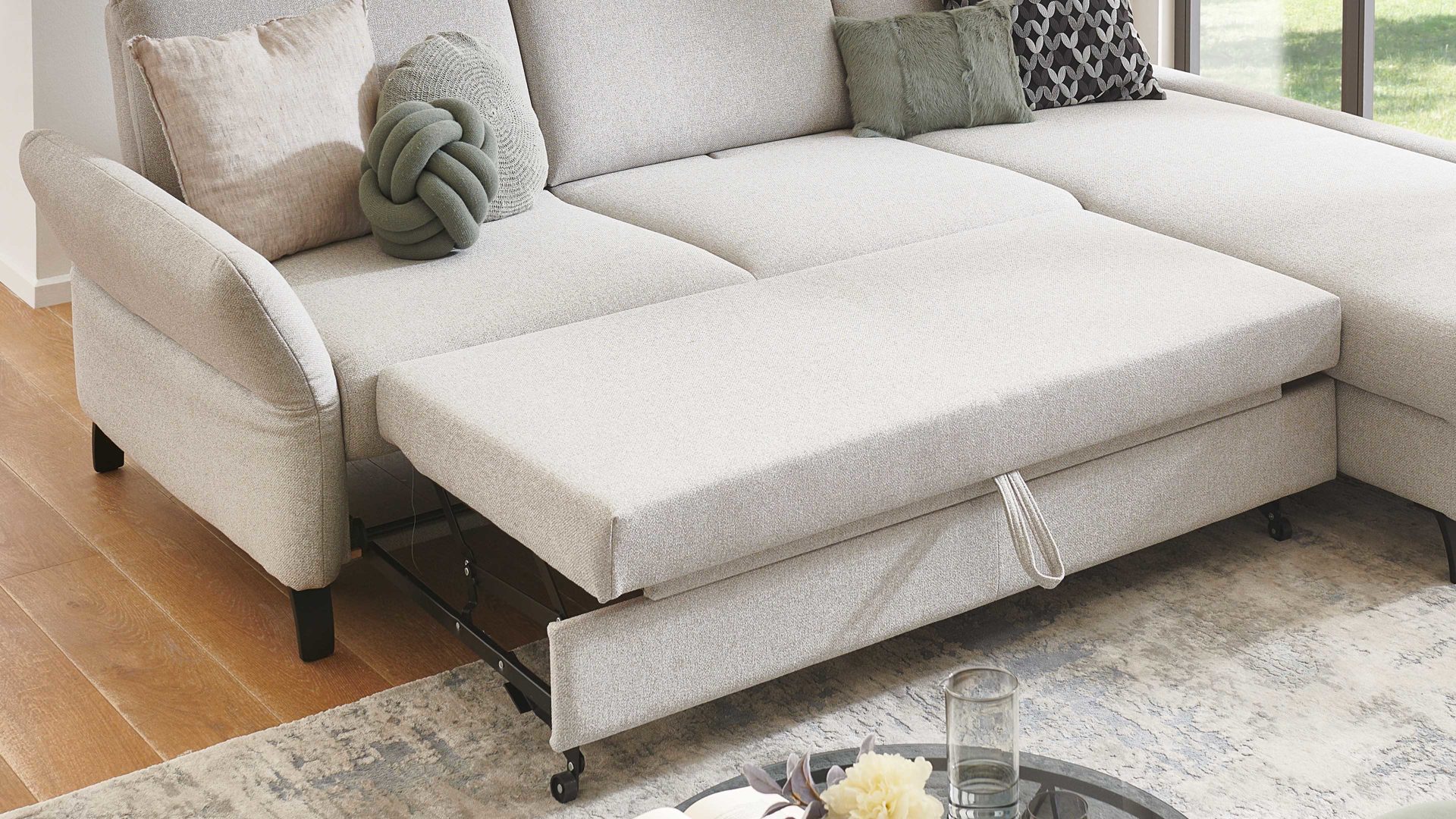 Die manuelle Querschläferfunktion aus dem Polsterprogramm Tiamo Plus ist die perfekte Ergänzung für Ihre Polsterecke. Diese Funktion ermöglicht es Ihnen, die Sitzfläche leicht nach oben und nach vorn auszuziehen, um eine bequeme Liegefläche von ca. 145 x 125 cm (L/BxT) zu erhalten, die mit Matratzenbezug ausgestattet ist.