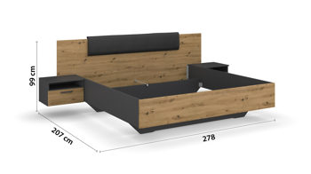 Das Doppelbettgestell ist nicht nur optisch ein Highlight, sondern bietet auch höchsten Komfort und Funktionalität. Mit einer Liegefläche von ca. 180 x 200 cm und Gesamtmaßen von ca. 278 x 99 x 207 cm (BxHxL) bietet es ausreichend Platz für zwei Personen. Zwei Hängenachttische sind inklusive und bieten praktische Ablagemöglichkeiten für Ihre persönlichen Gegenstände.