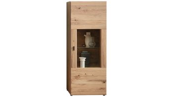eintürige Vitrine mit Glastür, dahinter zwei Glasböden und zwei Holzböden