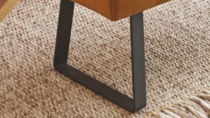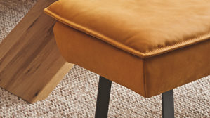 sonnengelber Lederbezug mit einer beigen Kontrastnaht und mattschwarzen Metallkufen