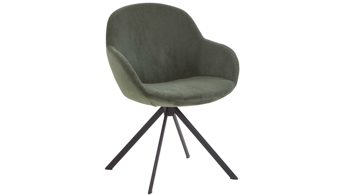 Er kombiniert ein mattschwarz lackiertes Stativgestell aus robustem Eisen mit einem lindgrünen Mikrofaserbezug in Lederoptik und fügt sich in verschiedene Wohnstile harmonisch ein. Zu den optischen Highlights des Esszimmerstuhls gehört neben der Formensprache und den perfekt aufeinander abgestimmten Farben der markante Quereinzug im Rücken. Praktisch begeistern die Drehbarkeit um 180 Grad mit Rückholfunktion sowie die bodenschonenden Gleiter am Gestell.