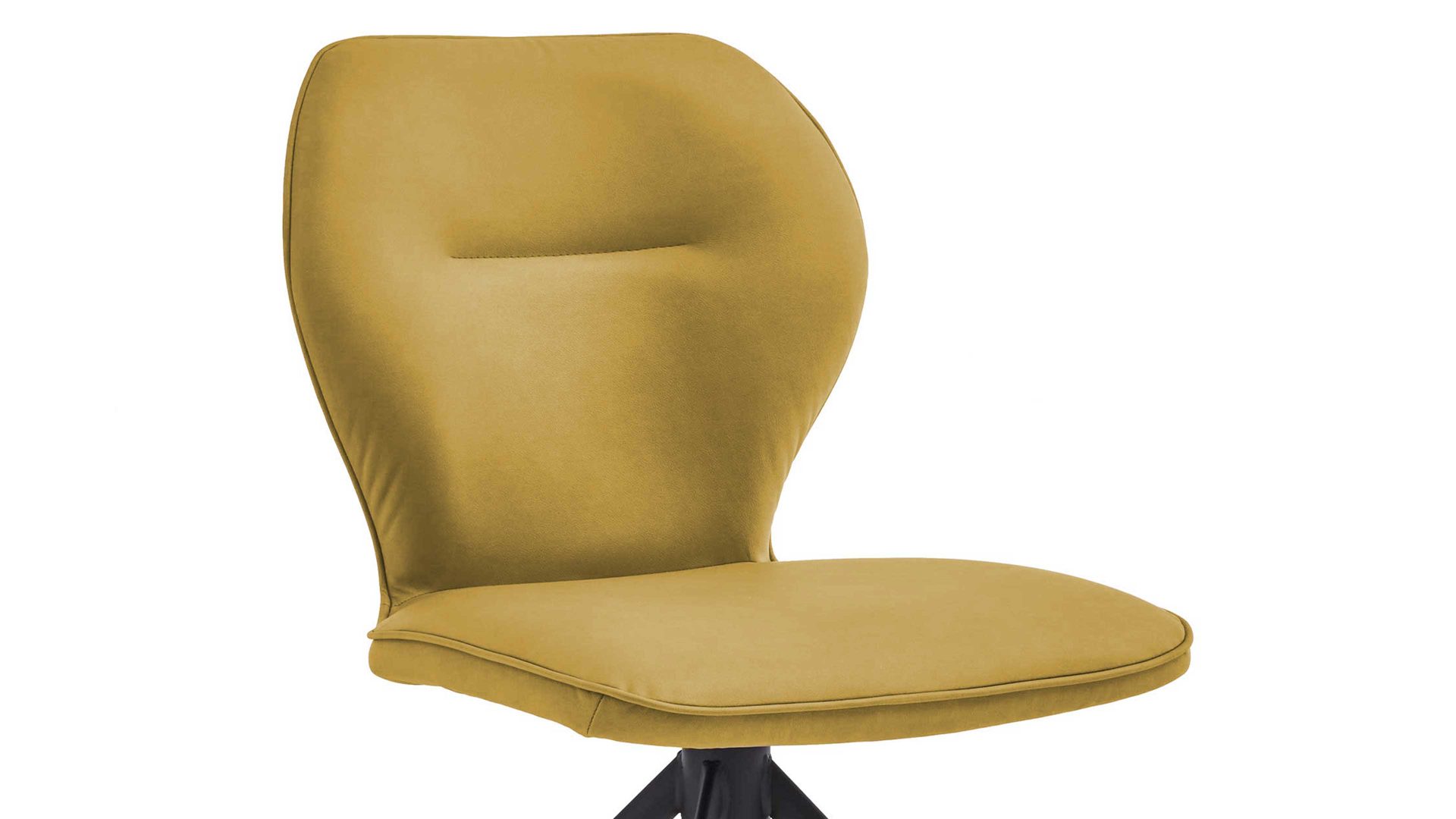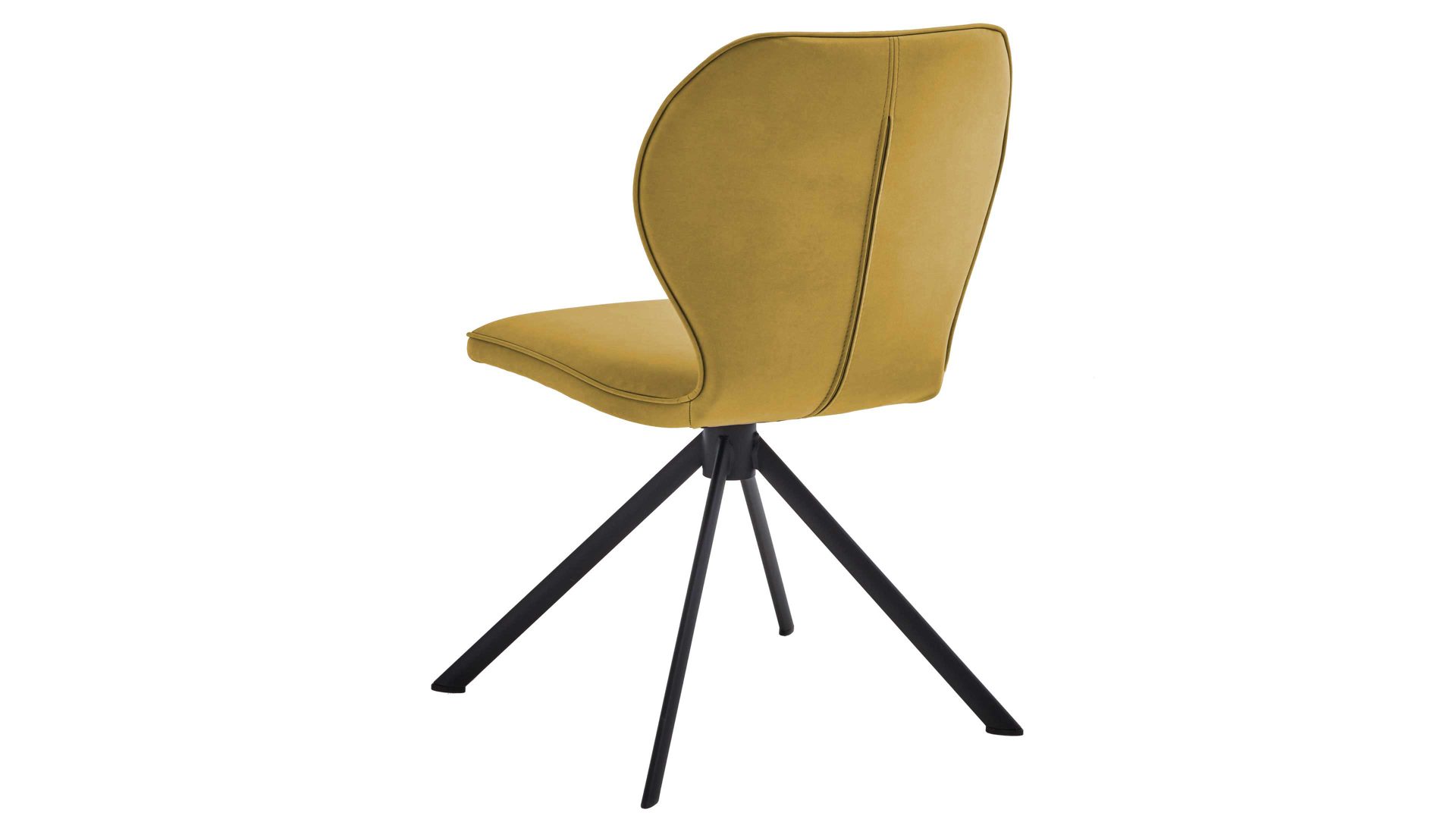 Er kombiniert ein mattschwarz lackiertes Stativgestell aus robustem Eisen mit einem curcumafarbenem Mikrofaserbezug in Lederoptik und fügt sich in verschiedene Wohnstile harmonisch ein. Zu den optischen Highlights des Esszimmerstuhls gehört neben der Formensprache und den perfekt aufeinander abgestimmten Farben der markante Quereinzug im Rücken.