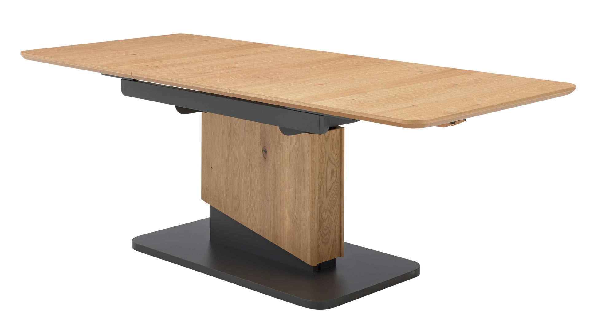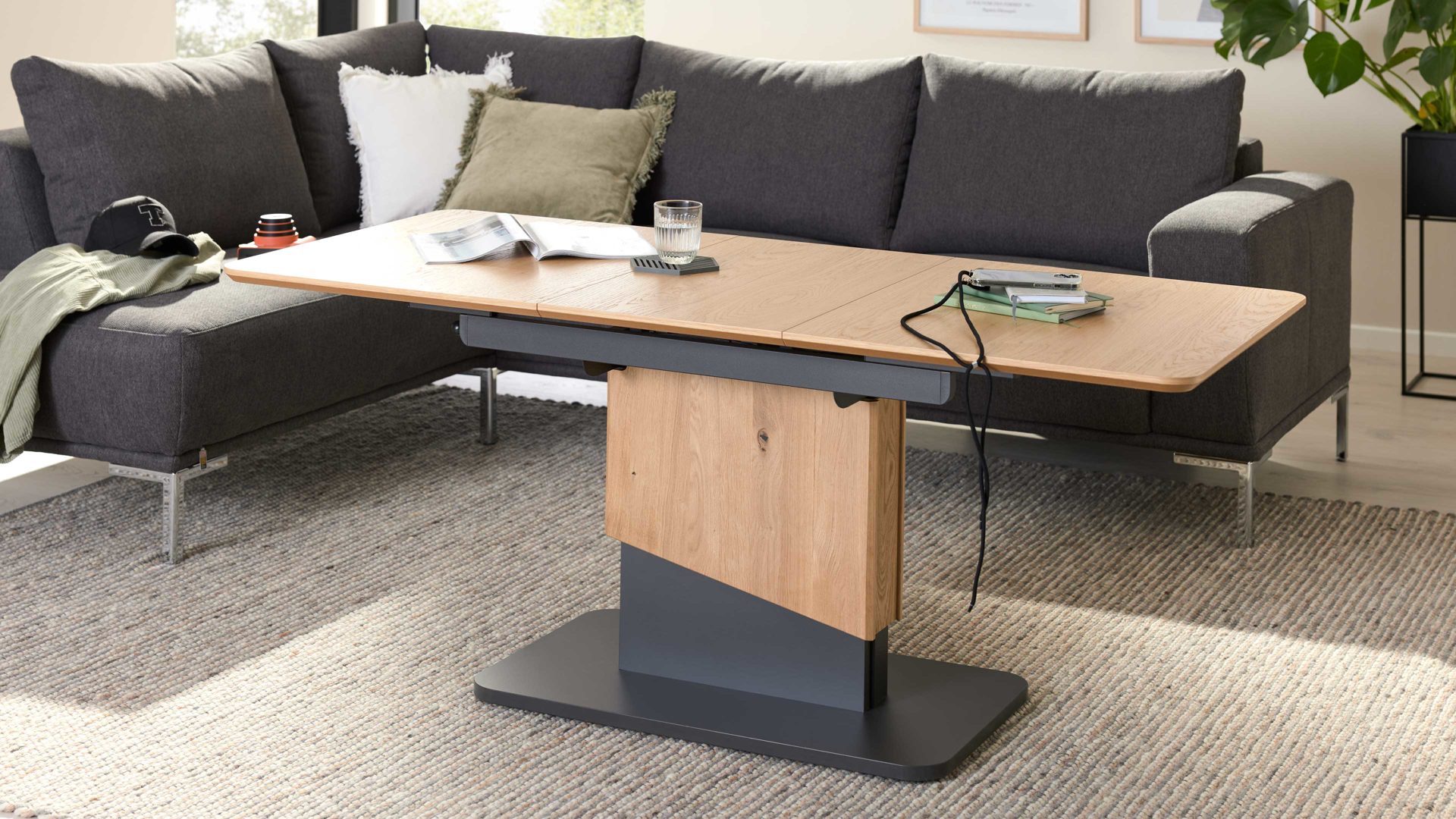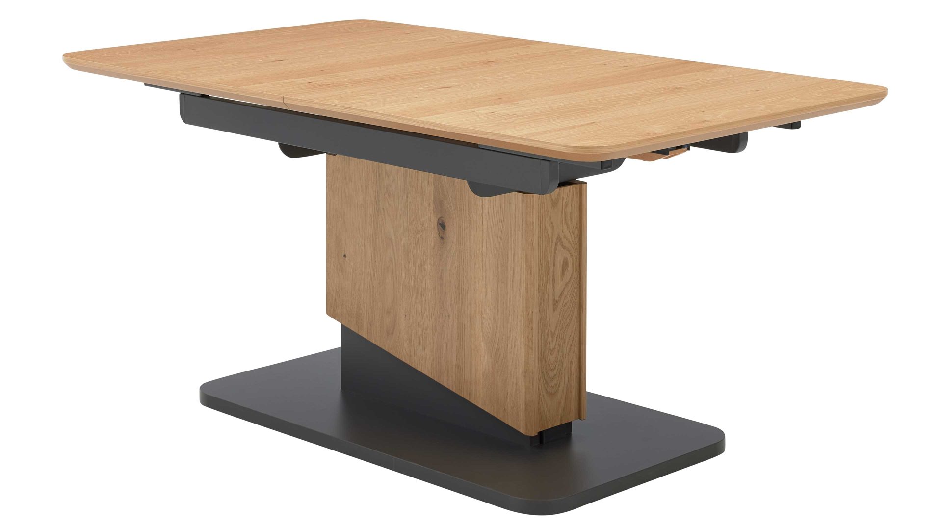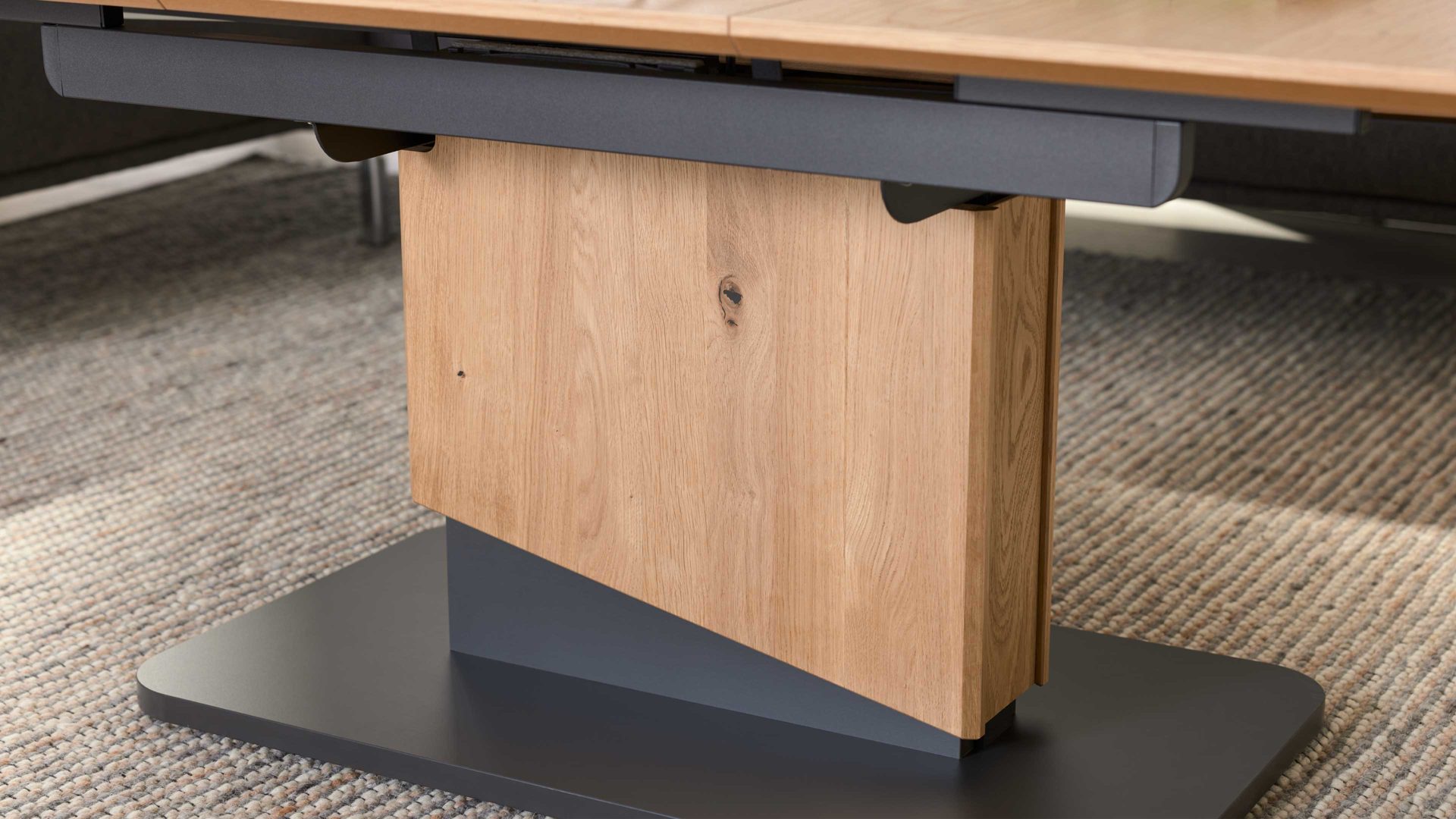Die Kombination aus natürlichem Wildeichefurnier, dunklen Akzenten und robusten Metallelementen in Anthrazit-Metallic sorgt für eine harmonische Balance zwischen Wohnlichkeit und modernem Design. Die feine Maserung der Tischplatte verleiht dem Tisch Tiefe und Wärme, während die klaren Linien und das formstabile Untergestell ein Gefühl von Leichtigkeit vermitteln.