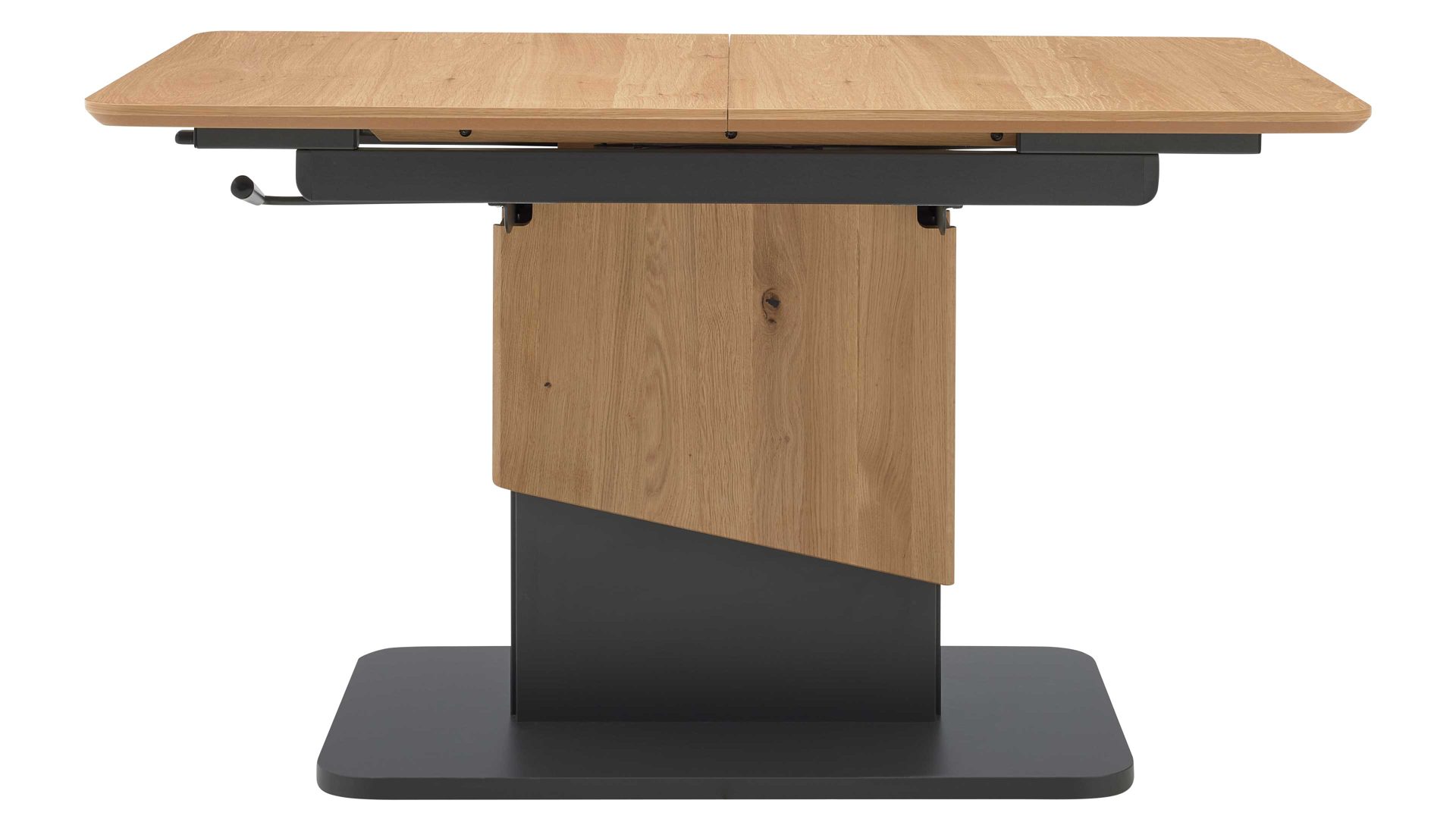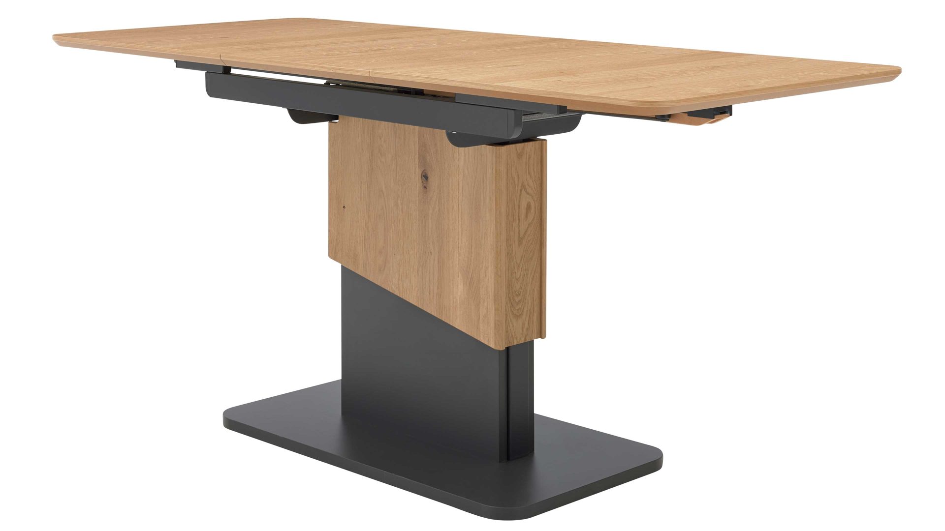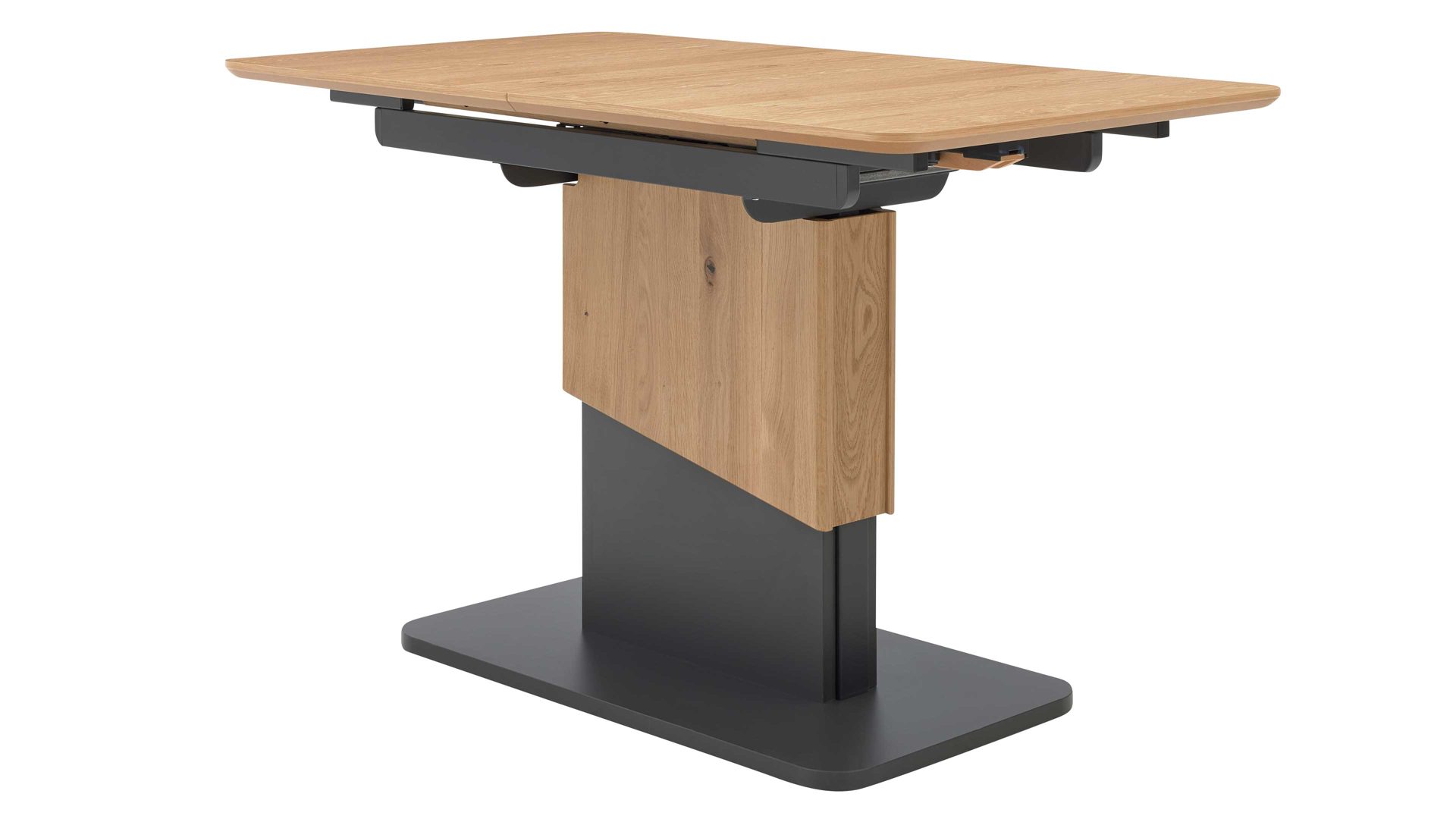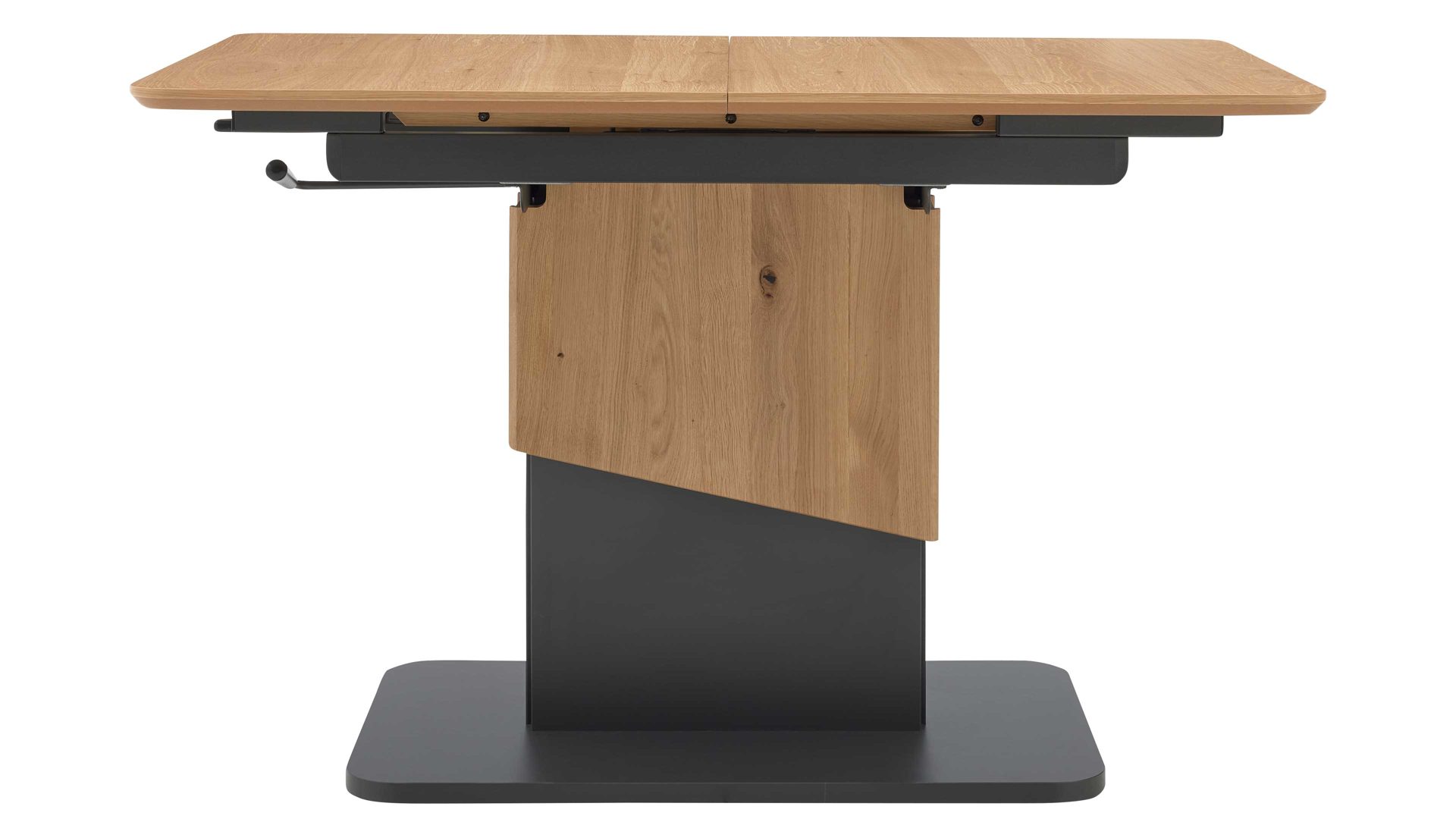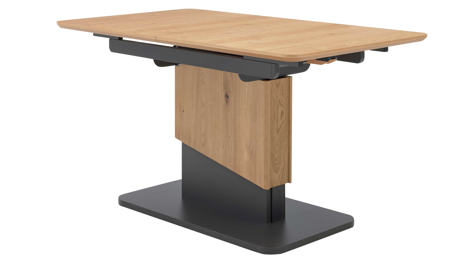 Die Kombination aus natürlichem Wildeichefurnier, dunklen Akzenten und robusten Metallelementen in Anthrazit-Metallic sorgt für eine harmonische Balance zwischen Wohnlichkeit und modernem Design. Die feine Maserung der Tischplatte verleiht dem Tisch Tiefe und Wärme, während die klaren Linien und das formstabile Untergestell ein Gefühl von Leichtigkeit vermitteln.