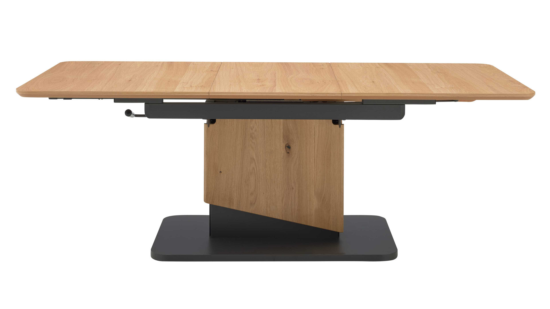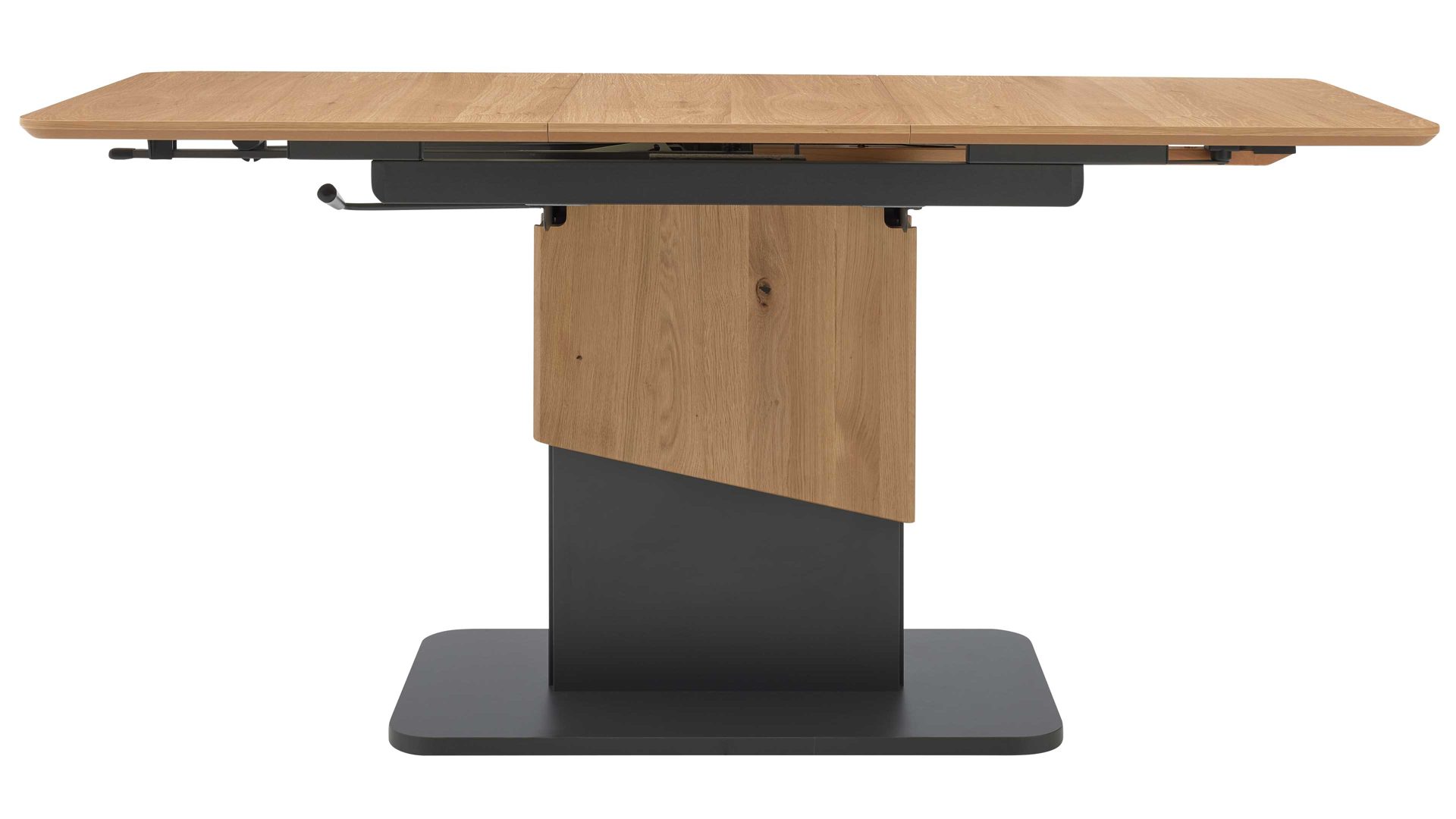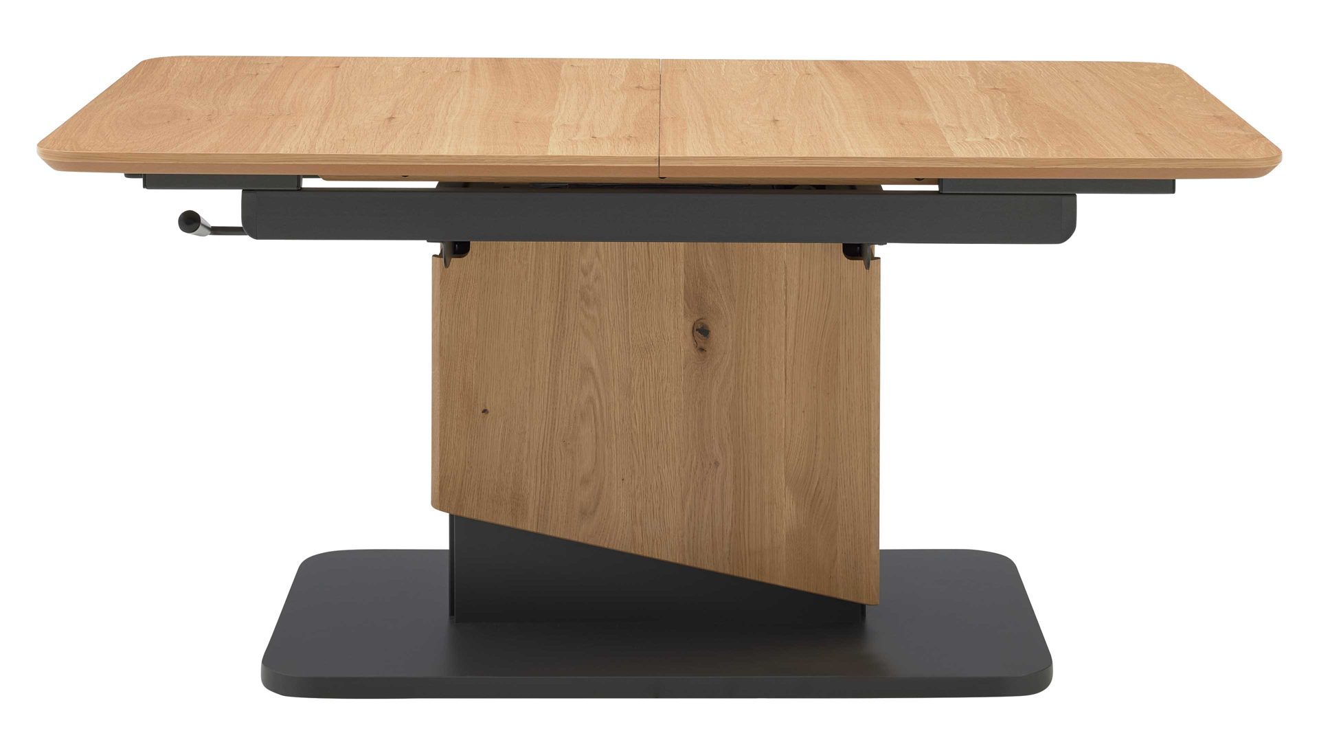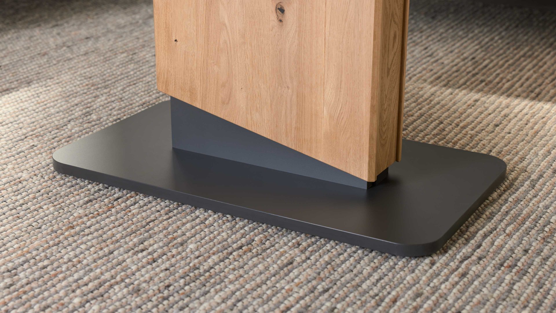 Die Kombination aus natürlichem Wildeichefurnier, dunklen Akzenten und robusten Metallelementen in Anthrazit-Metallic sorgt für eine harmonische Balance zwischen Wohnlichkeit und modernem Design. Die feine Maserung der Tischplatte verleiht dem Tisch Tiefe und Wärme, während die klaren Linien und das formstabile Untergestell ein Gefühl von Leichtigkeit vermitteln.