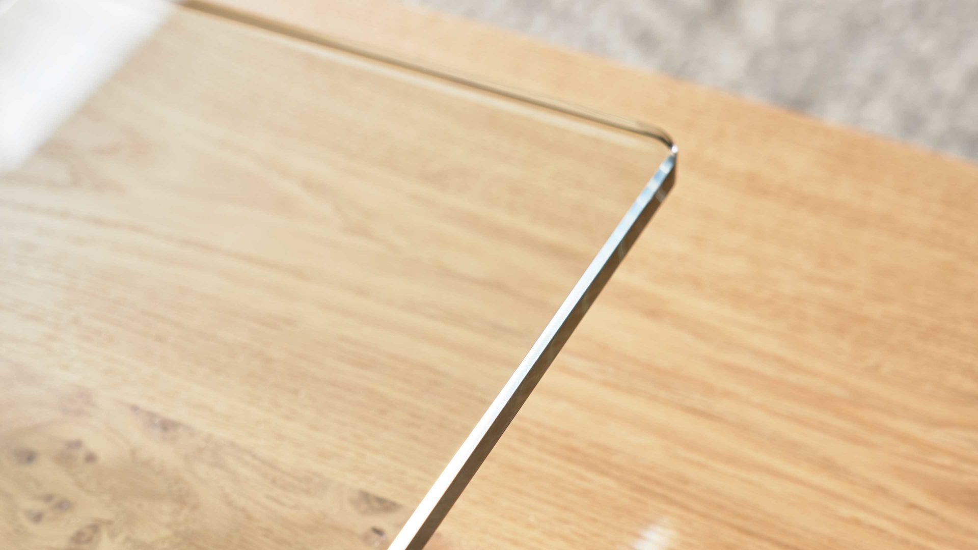Ein besonderes Highlight sind die zwei versetzten Tischplatten aus Glas und Furnier, die dem Tisch eine elegante Leichtigkeit und architektonische Raffinesse verleihen. Die ca. 10 mm starke Glasplatte ist um 360 Grad drehbar – so kannst du sie flexibel ausrichten und die Ablagefläche jederzeit an deine Bedürfnisse anpassen.