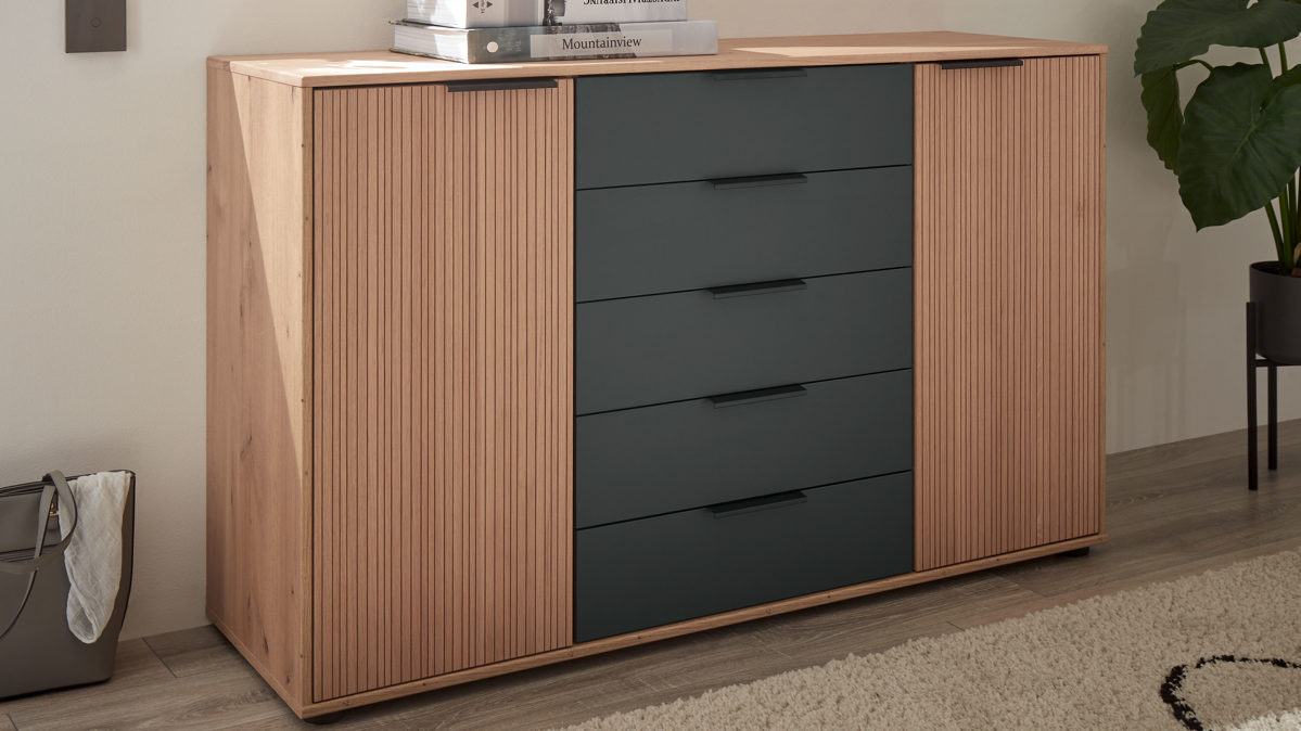 zwei leise schließende Drehtüren, dahinter jeweils ein höhenverstellbarer Einlegeboden und fünf geräumige Schubladen mit Selbsteinzug