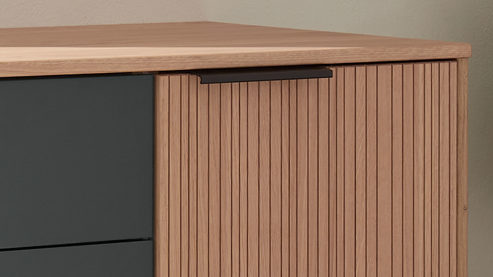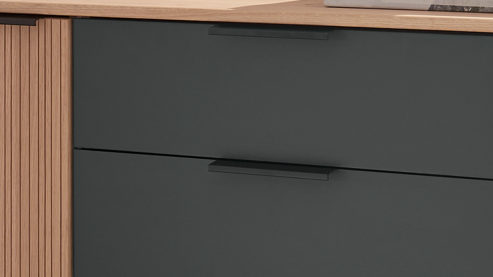 biancofarbene Eichenholzfronten mit Rillenstruktur, kombiniert mit mattem Graphit, Korpus in biancofarbener Eiche Nachbildung und graphitfarbenen Metallgriffen
