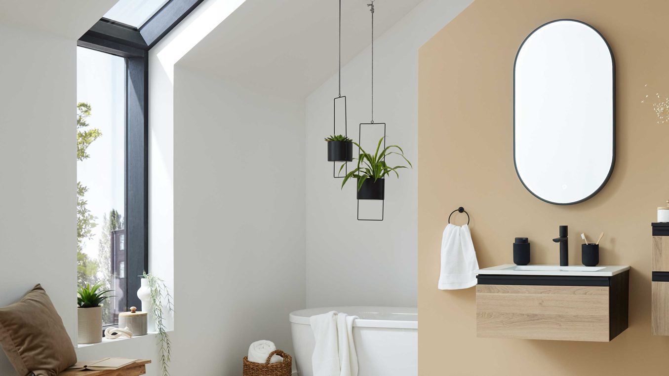 Ein echtes Highlight ist der ovale Spiegel mit schwarzem Metallrahmen. Die umlaufende LED-Beleuchtung (12,9 Watt) sorgt mit 1404 Lumen für optimale Lichtverhältnisse und lässt sich in drei Lichtfarben einstellen – 2700 K (warmweiß), 4500 K (neutralweiß) oder 6500 K (tageslichtweiß). Über den integrierten Sensor steuerst du sowohl die Emotion-Beleuchtung als auch die Spiegelheizung, die sich nach 60 Minuten automatisch abschaltet. Der 30-Watt-LED-Converter ist inklusive. Maße: ca. 50 x 90 x 3 cm (BxHxT). Energieeffizienzklasse F (Spektrum A bis G).