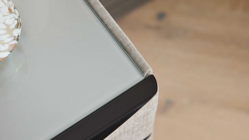 Der mit silberfarbenem Stoff bezogene Korpus verleiht der Nachtkommode ein elegantes Erscheinungsbild und eine angenehm weiche Haptik. Die aluminiumfarben getönte Glasauflage setzt einen dezenten Akzent und sorgt gleichzeitig für eine pflegeleichte Oberfläche. Schwarze Kunststoffgleiter und edle Metallgriffe ergänzen das Design und unterstreichen den modernen Charakter.