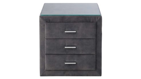 Der rundum stoffbezogene Holzkorpus sorgt für eine angenehme Haptik und verleiht der Kommode eine wohnliche Optik. Die pflegeleichte Glasplatte schützt nicht nur die Oberfläche, sondern bringt mit ihrer lichtreflektierenden Wirkung eine edle Note ins Schlafzimmer. Drei geräumige Schubladen mit Metallauszugsschienen bieten ausreichend Platz für persönliche Dinge – von Lesebrille bis zur Nachtlektüre. Schwarze Kunststoffgleiter schützen den Boden und sorgen für einen sicheren Stand.