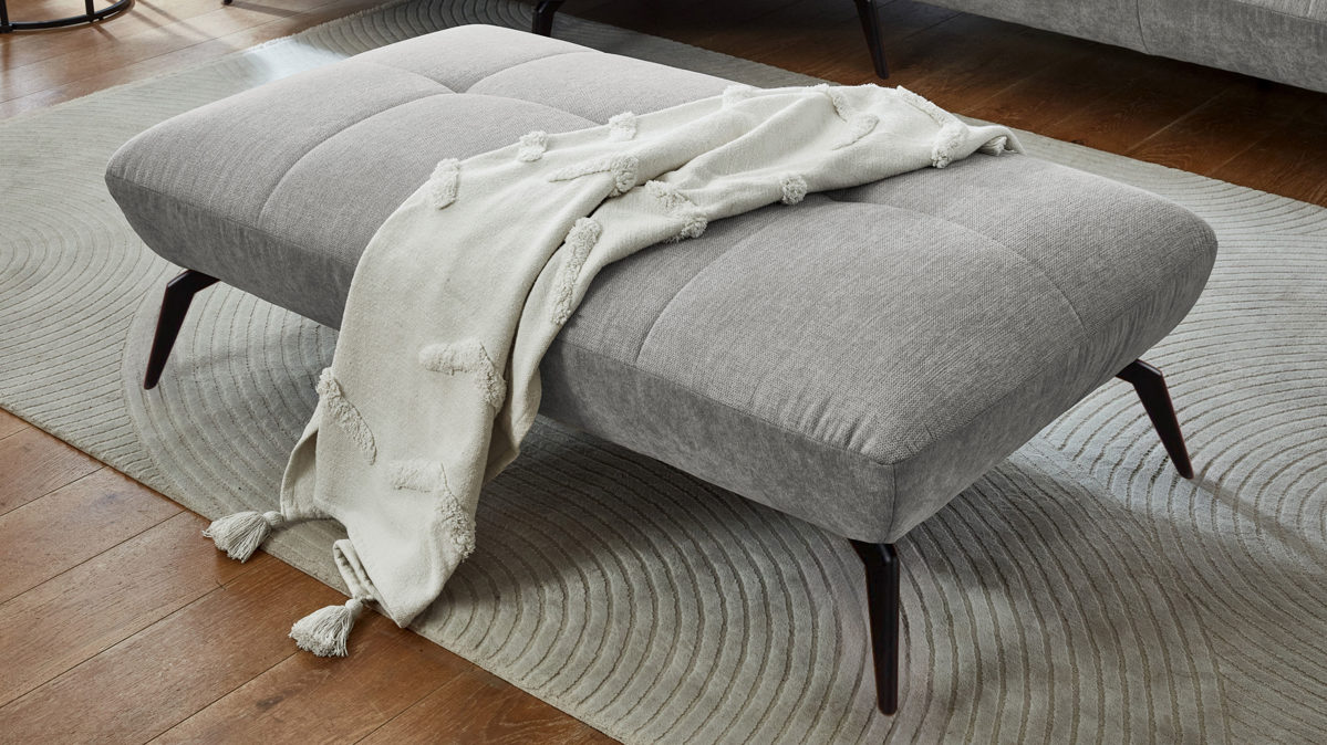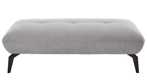 Die spezielle Kombination aus silberfarbenen Stoffbezügen sorgt für ein edles Design. Mattschwarze Metallfüße runden die Optik stimmig ab und tragen überdies zur Stabilität des attraktiven Hockers bei. Einen gelungenen Akzent setzt die gesteppte Sitzfläche. Der Korpus des XXL-Hockers ist glatt bezogen.