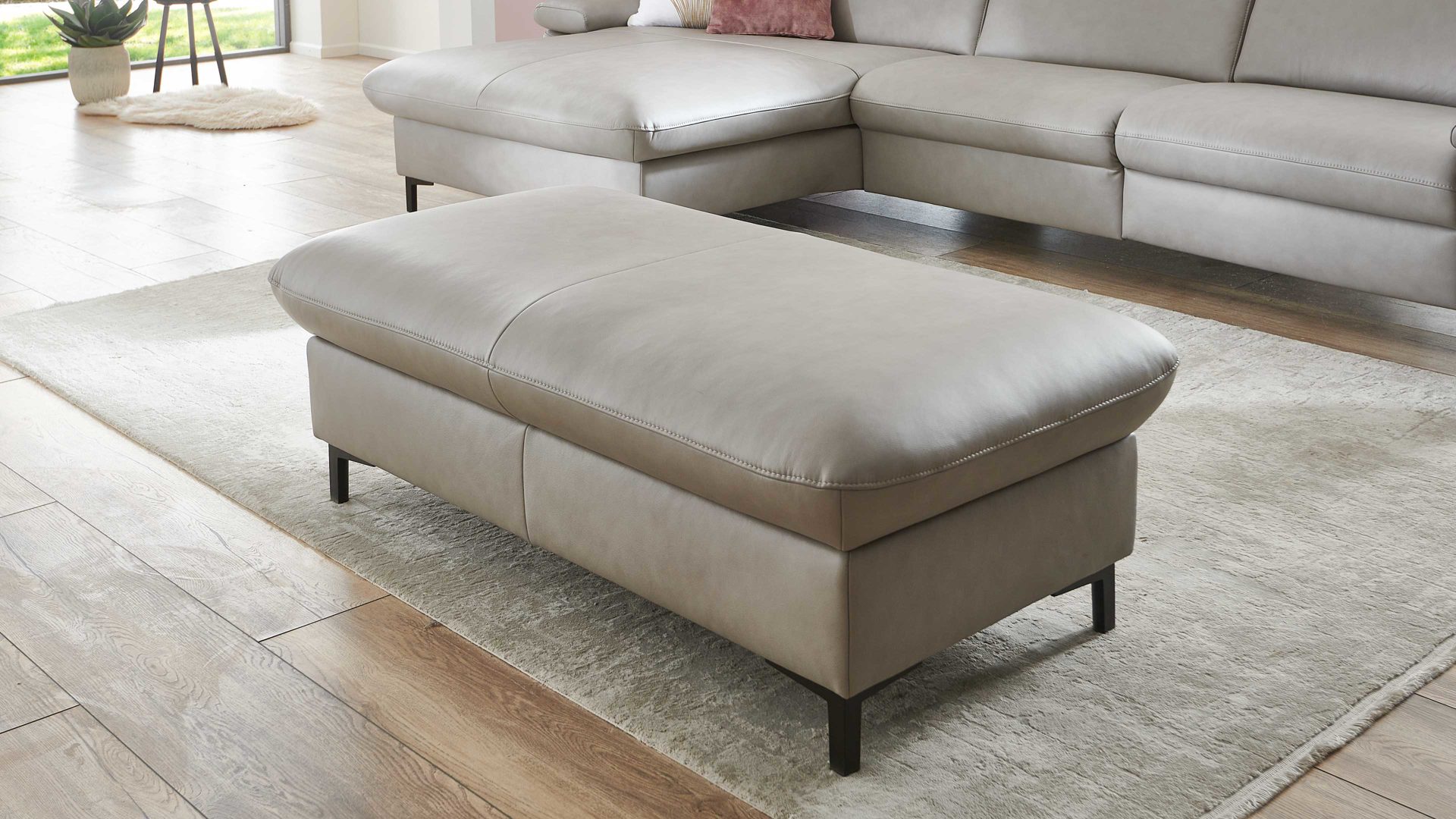 Dieser silberfarbene XXL-Polsterhocker aus dem Polsterprogramm New Jersey zeichnet sich durch seine moderne und gemütliche Ausstrahlung, eine exzellente Material- und Verarbeitungsqualität sowie extra hohen Sitzkomfort aus.