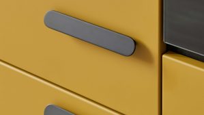 Die WERT KÜCHE® Vanessa bringt Farbe in Ihren Alltag. Mattes Olivegelb trifft auf Eiche Siena Nachbildung und schafft einen spannenden Kontrast aus moderner Frische und natürlicher Wärme. Schwarze Bügelgriffe und eine onyxschwarze Arbeitsplatte mit Struktur unterstreichen den markanten Look und verleihen der Küche eine klare, zeitgemäße Linie.