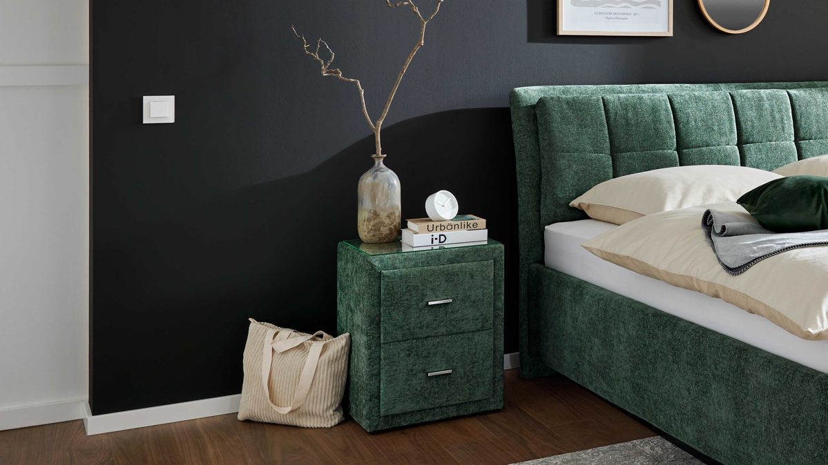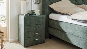 Kombiniere die Nachtkommode idealerweise mit dem passenden Polsterbett der Serie, um ein stimmiges Gesamtbild zu erzielen.