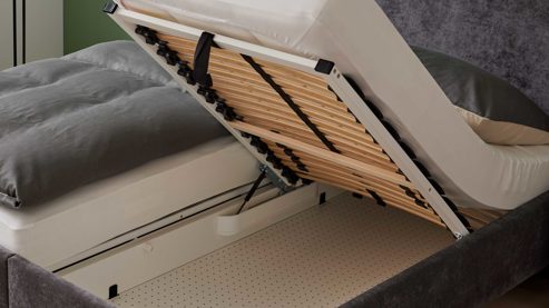 Die integrierten Bettkästen sind ideal für saisonale Textilien und sorgen für mehr Ordnung in deinem Schlafzimmer.