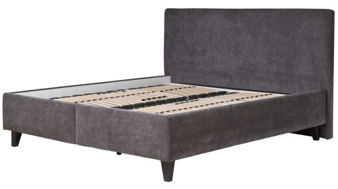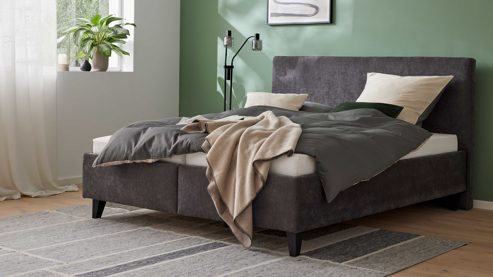 Die Kombination aus anthrazitfarbenem Bezug und schwarzen Holzfüßen sorgt für eine moderne, ruhige Optik in deinem Schlafzimmer.