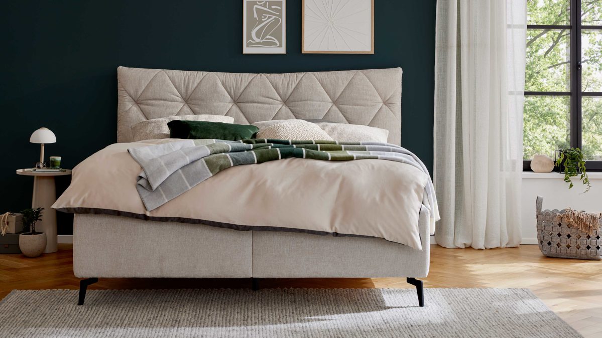 Du suchst ein Polsterbett mit Stauraum, das Komfort und Design stilvoll vereint? Das Polsterbett aus Interliving Bettensystem Serie 1420 begeistert mit einem naturfarbenen Stoffbezug, eleganten mattschwarzen Metallfüßen und einem geschwungenen Polsterkopfteil mit Rautensteppung. Mit ca. 205 x 128 x 223 cm (BxHxL), einer großzügigen Liegefläche von ca. 180 x 200 cm (BxL) und einer komfortablen Liegehöhe von ca. 61 cm bietet dir dieses Doppelbett beste Voraussetzungen für erholsamen Schlaf.