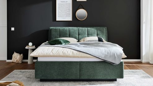 Kissen, Plaid und Nachtkommoden sowie weitere dargestellte Einrichtungsgegenstände sind separat gegen Mehrpreis bestellbar.