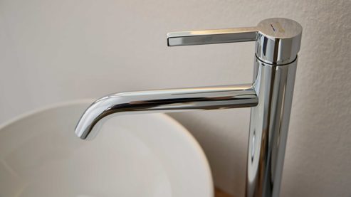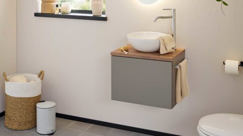 Die Abbildung zeigt ein Wohnbeispiel, welches auch Dekoration sowie separat erhältliches Zubehör enthält. Im Lieferumfang enthalten sind zwei Hängeschränke, ein Spiegelschrank ohne Aufsatzleuchte und Steckdose, ein Waschbecken, eine schwarze Armatur, zwei schwarze Handtuchhalter und ein Waschbeckenunterschrank.