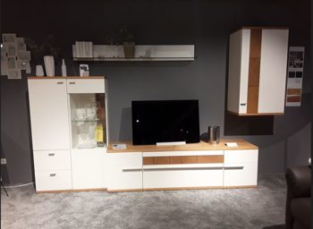 • Die Abbildung zeigt ein Wohnbeispiel, welches auch Dekoration sowie separat erhältliches Zubehör enthält. Im Lieferumfang enthalten ist die Wohnwand 620001 , bestehend aus einem Lowboard, einem Wandboard, einer Hängevitrine, ein Wandpaneel und ein Hängeelement.