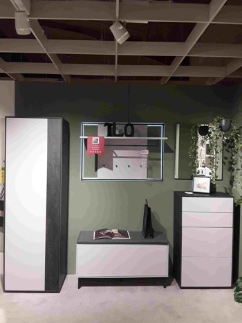• Die Abbildung zeigt ein Wohnbeispiel, welches auch Dekoration sowie separat erhältliches Zubehör enthält. Im Lieferumfang enthalten ist eine Wandgarderobe INL-800 (rechts im Bild).