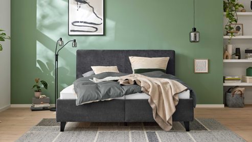 • Die Abbildung zeigt ein Wohnbeispiel, welches auch Dekoration sowie separat erhältliches Zubehör enthält. Im Lieferumfang enthalten ist ein Boxspringbett.